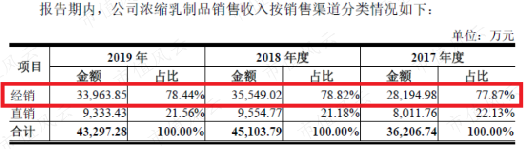 2017-2019年,浓缩乳制品的销售收入里,接近80%是源自经销模式,可见经销模式是熊猫乳品主要的销售模式。