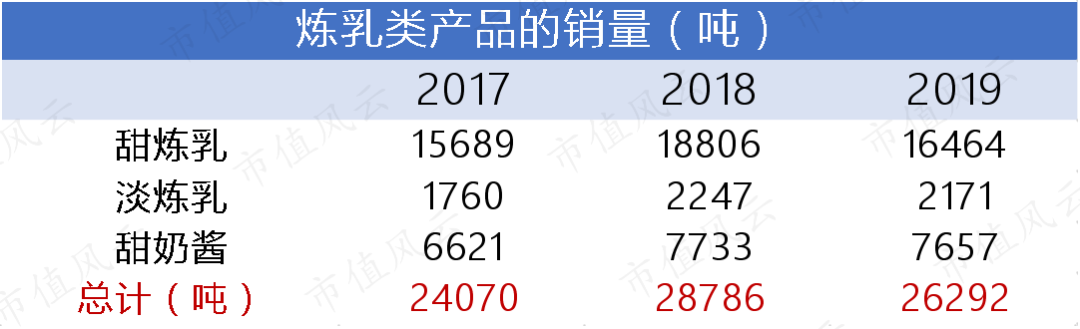 实际上,同期炼乳类产品的销量变化也是类似,总体的销量从2018年的2.9万吨下降至2019年的2.6万吨。略有不同的是,这一次,甜炼乳、淡炼乳以及甜奶酱三者的销量,在2018-2019年期间,都是下降的,情况更加不乐观。