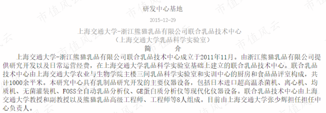 熊猫乳品自己不单独搞研发,而是采用与高校合作的技术研发模式。早在10年之前,熊猫乳品就和上海交通大学的农业与生物学院联合成立了联合乳品技术中心。
