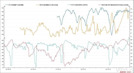 图3 聚酯开工率及库存,江浙织机开工率和坯布库存