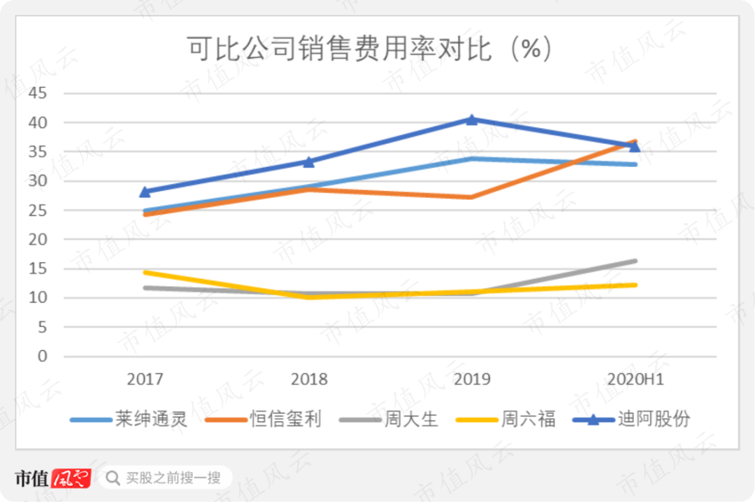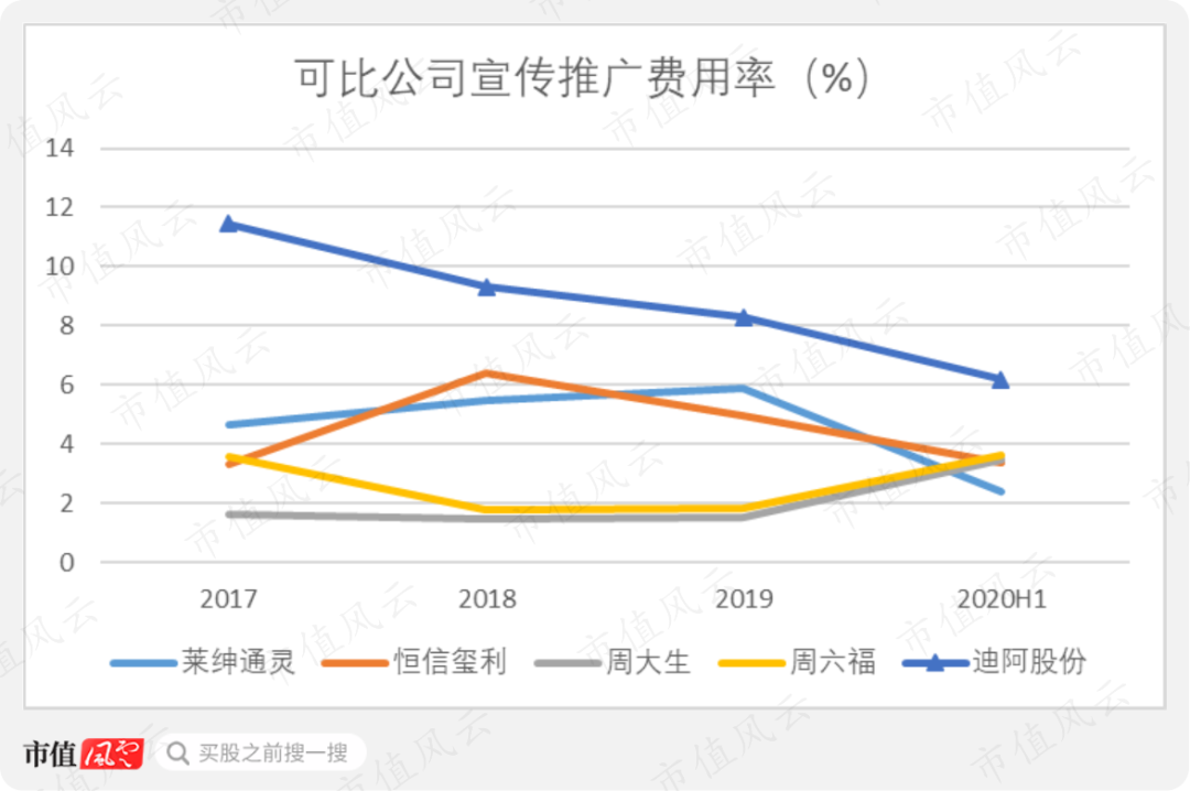 选择招股说明书中列举的莱绅通灵、恒信玺利、周大生、周六福等四家公司作为可比公司,可以发现,2016年-2020年6月,迪阿股份的宣传推广费率虽然明显下滑,但仍明显高于其他四家公司。
