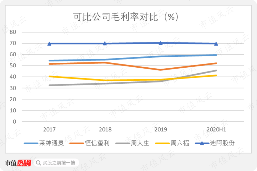 一方面,这是由于迪阿股份的销售模式以自营为主,省去了向加盟商批发让利的环节;另一方面,产品打出的定制化、“唯一”等感情牌,也在一定程度上增加的产品的溢价。
