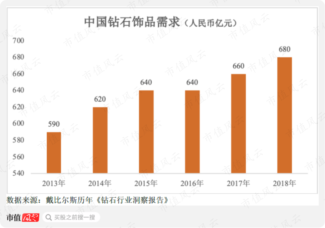 从整个行业来看,根据戴比尔斯的调查数据显示,2018年,我国钻石饰品的需求大约为680亿元。