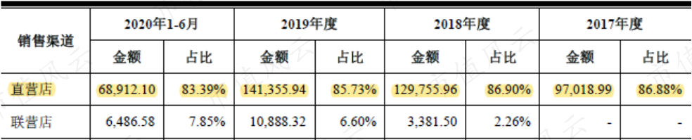 另外,迪阿股份的线下渠道以直营店为主。从收入上看,2017-2019年期间,联营店实现的销售收入占比不足10%。