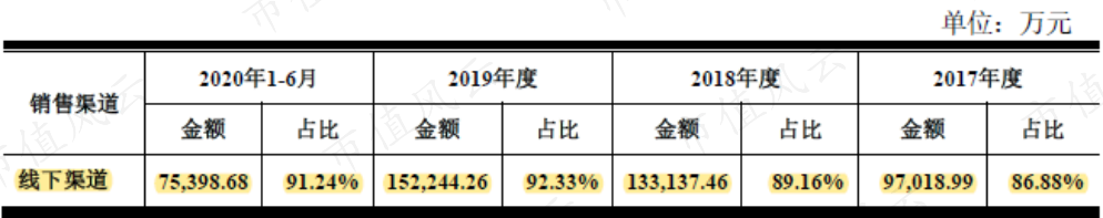 从上表的数据可以看出,2017-2019年,迪阿股份营业收入的九成左右,都是借助线下渠道实现的。