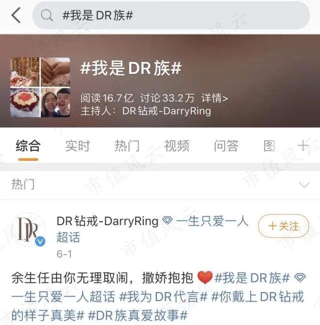 迪阿股份还为自己的粉丝赋予了一个统一的称号——DR族,此前,还曾经在新郎微博发起一个#我是DR族#的话题。这个话题至今还带着热乎劲,目前已经吸引了超过16亿次阅读量,33.2万条讨论。