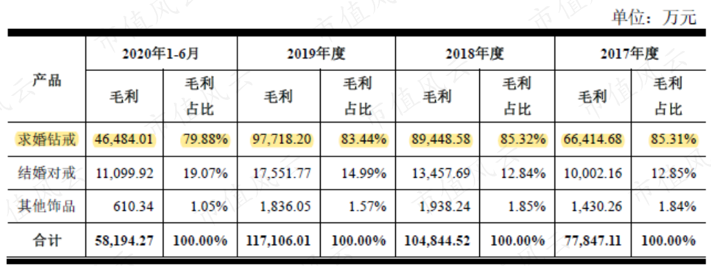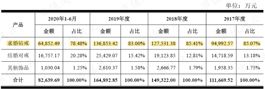 2017-2019年,销售求婚钻戒实现的营业收入,分别占到营业总收入的85.07%、85.41%、83.00%,均超过了整体收入的4/5。