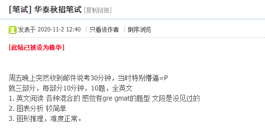 对于应届生求职来说,行测和性格测试属于笔面试环节的敲门砖。在秋招笔试之时,华泰证券采用的全英文“行测”笔试,遭到了不少学子的吐槽。有应届生表示,华泰证券全英文笔试共计30分钟,分别为阅读理解、数学统计和图形推理,“基本是英文版的行测,既没考CFA,也没考基本证券常识”。