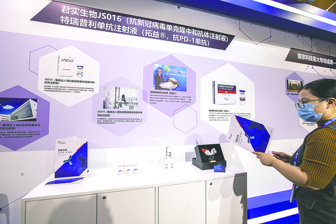 2020年10月28日,君实生物展出的特瑞普利单抗注射液(拓益,抗PD-1单抗)等产品视觉中国图