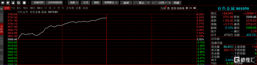 截止今日早盘收盘,有色板块个股,怡球资源(维权)、云铝股份、西部材料、华峰铝业等9只股票涨停,明泰铝业、云南铜业、和胜股份逼近涨停。申万有色金属指数的个股几乎全线飘红,该指数包含个股公121只,翻绿仅6只,其他均呈现不同程度的上涨。