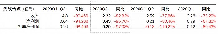 受疫情影响,前三季度光线总收入4.8亿、同步下滑80.46%;净利润6400万,同比下滑94.26%。其中第三季度收入2.22亿,同比下滑82.82%。主要原因则是去年同期的《哪吒之魔童降世》的成绩过于亮眼。