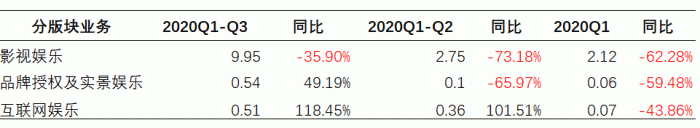 但公司对影视娱乐业务的依赖仍然没有较大改观。由于疫情影响,公司曾大力发展的实景娱乐业务在上半年处于停滞状态。公司影视娱乐板块前三季度9.95亿的收入仍然占到总收入的89.88%。