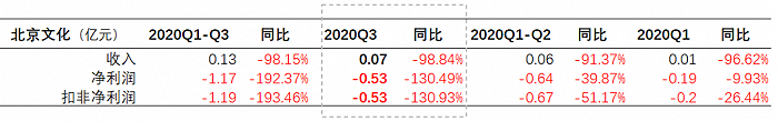 由于无电影项目上映,公司前三季度收入1308万元,同比下滑98.15%,亏损1.17亿,净利润同比下滑近2倍。其中,第三季度收入仅为743万元,同比下滑98.84%,亏损5260万,同比下滑130.49%。
