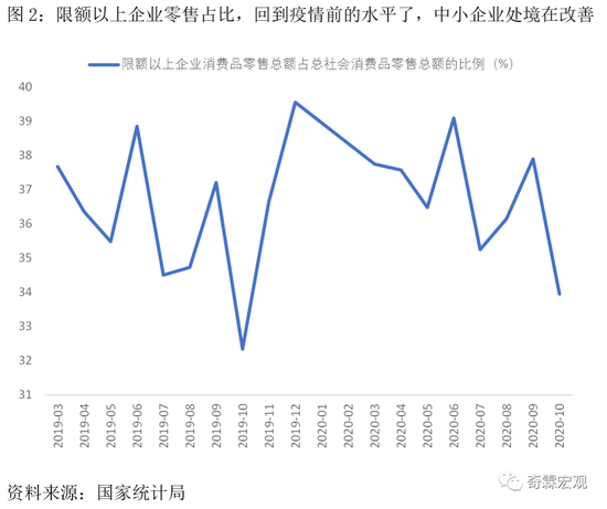 第二,限额以上企业社零占社会消费品零售总额的比例,从9月的37.9%回落到34.0%,回到2019年的水平了。这说明限额以下企业的零售加快恢复,中小型企业的处境在改善。