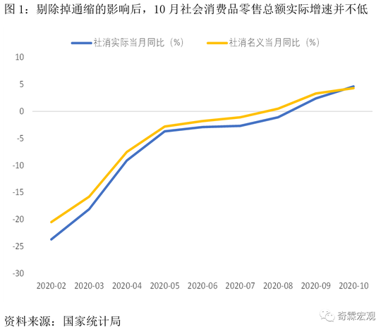 如果剔除掉价格因素的影响,10月的消费其实并不差,消费复苏动能被通缩低估了。
