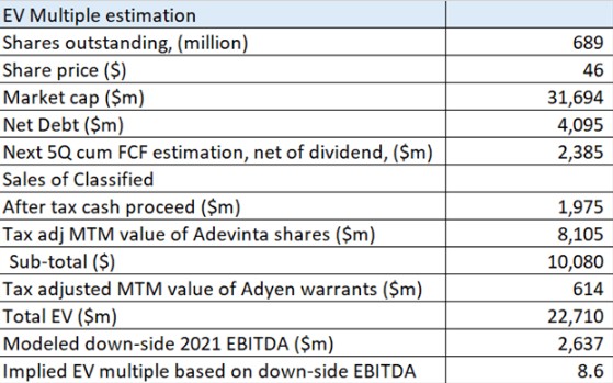 为了估算eBay的EV倍数,分析师对其EV进行了建模。如图2所示,在EV模型中包含了两个项目,首先是Classified的税后收入,第二个是Adyen认股权证的价值。分析师假设以21%的税率来确定这些资产的税后现金价值。图2显示,以当前每股46美元的价格计算,基于EBITDA下行模型的隐含EV倍数约为8.6,公司2021年的营收和EBITDA可能会高于下行模型,这意味着隐含的远期市盈率甚至低于8.6!