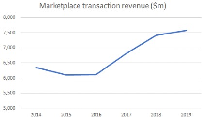 eBay有两个主要的收入来源:交易收入和广告收入(交易收入主要为流量费,eBay提供卖家免费平台服务),交易收入占第三季度营收的比例略高于90%。图4显示了交易收入的长期趋势,2014 -2019年其复合年增长率为3.6%。
