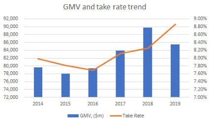 交易收入由两个因素驱动,即GMV和入驻率。GMV是指用户在eBay平台上成功完成的所有交易的总价值。收费率是净交易收入除以GMV,它是卖家向公司支付的在其平台上销售的总费用。图5显示了GMV和入驻率的长期趋势,也显示了投资者对核心业务的关注。营收增长主要来自入驻率的增长,而GMV增长率在卫生事件前表现疲弱,但公司将2019年GMV下降归咎于销售税法律的变化。