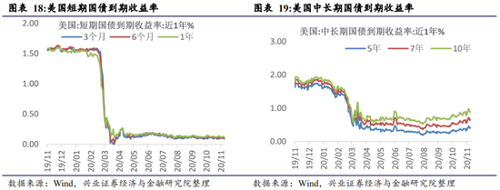 全球市场,长期美债收益率小幅上行。11月6日-11月13日,1年期美国国债收益率下降0bp至 0.12%,5年期国债收益率上升8bp至0.41%,10年期国债收益率上升10bp至0.89%。