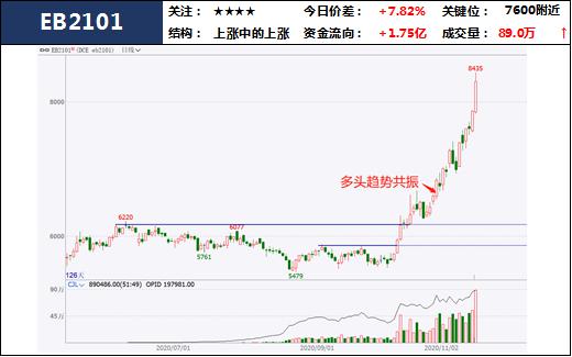 苯乙烯基本面维持强势。供给端,11月两套装置检修将带来国内市场货源供应的缩减,叠加港口持续去库导致库存较低,苯乙烯供应紧张。需求端,终端产品价格维持强势,苯乙烯三大下游开工率均维持在高位,且下游价格持续上涨,对苯乙烯价格支撑较强。不过双十一过后需求预计将有所回落,警惕价格反弹。技术上,苯乙烯多头趋势强劲,今日再次冲击新高,多单可持有。