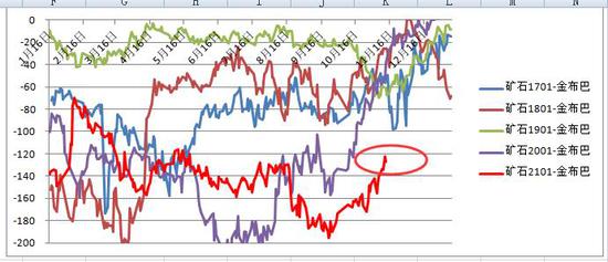 2020.11.12日矿石1月贴水现货127,贴水幅度在历年同期最大