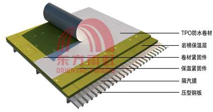 根据本项目工程地理位置及项目特点,本屋面防水工程设计为:≧0.75mm厚YX35-125-750压型钢板+0.3厚PE隔离层+50mm厚岩棉板固定+1.5mm厚聚酯内增强型TPO(搭接边热风焊接),本屋面系统防水卷材采用东方雨虹(ORIENTAL YUHONG)热塑性聚烯烃(TPO)防水卷材,对项目防水的耐久性、节能及其施工质量都可达到业主的使用需求,降低业主方由于渗漏水造成的损失。
