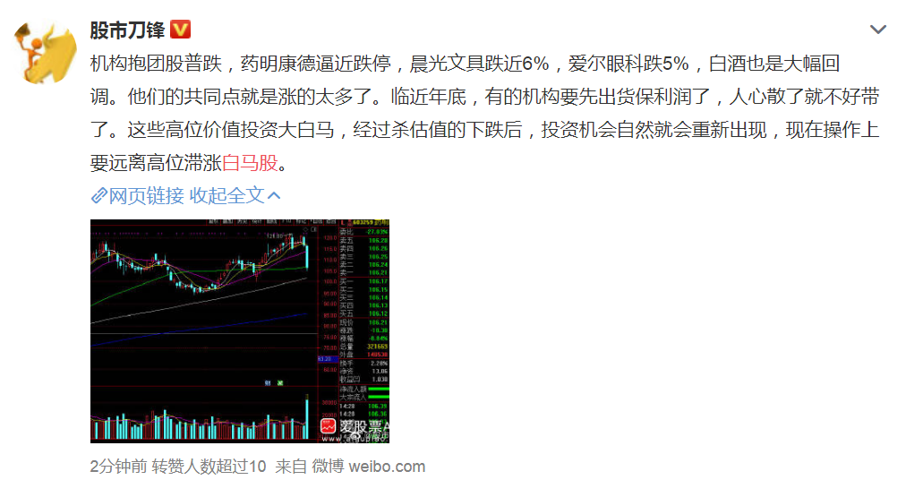 有网友评论认为,高位的权重股白马股年底被杀估值,其根本原因在于,机构今年已经赚太多了,到了年底纷纷获利止盈,保住今年的收益。