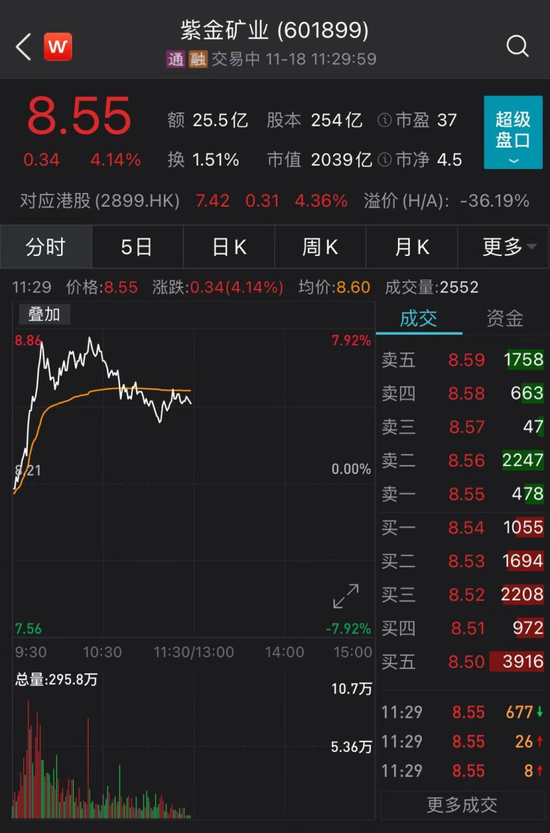 其中,表现极为亮眼的有色板块的市值龙头,在近日有色金属的热度带动下,紫金矿业也是疯狂大涨,截止至今日午盘,紫金矿业涨幅为4.14%,报8.55元/股,股价再创新高。紫金矿业的总市值达2039亿,成功跻身A股总市值排名前60,成为有色金属板块目前唯一一家市值破两亿的上市公司。