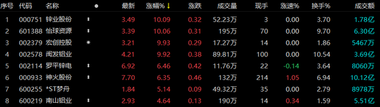 今日,有色金属板块继续拉升走强。截至午盘,有色金属板块已有4家涨停,分别是锌业股份、怡球资源、宏创控股和闽发铝业。罗平锌电(维权)和紫金矿业盘中也一度涨幅超8%。