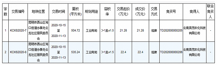 另外,4宗位于昆明市晋宁区晋宁工业园区面积约85亩的工业用地,交易起价约1814万元,起始楼面价约180~600元/㎡。
