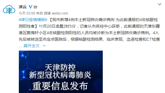 据天津日报、津云新闻20日凌晨消息,天津新增4例本土新冠肺炎确诊病例,为此前通报的4名核酸检测阳性者。