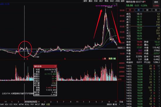 今年8月初,海利生物股价冲高到54.03元,而后直线跳水,最新收盘价仅为18.08元,高位下来跌幅高达66.54%。