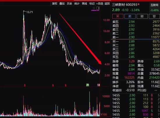 三峡新材自2015年6月高位下来,跌幅更为惨烈。2015年6月初,三峡新材的股价(复权)为13.71元,而今最新股价仅为2.89元,高位下来跌幅高达79%。