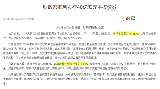 财政部官网11月19日信息显示,11月18日,财政部顺利发行40亿欧元主权债券。