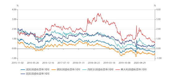 今年以来,除了在3月因全球恐慌情绪大增收益率短暂上行以外,欧洲国家的国债收益率大部分时间都维持在历史低位。