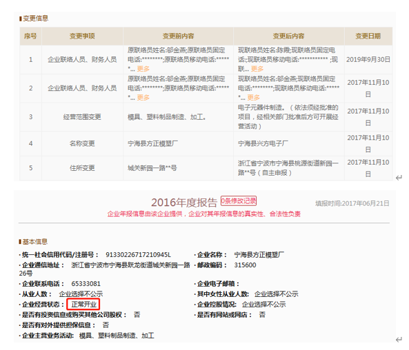 由方永杰担任负责人、注册成立于1999年的宁海县方正模塑厂的经营范围为“模具、塑料制品制造、加工”, 在 2017 年 11 月之后才变更为“电子元器件制造”,并更名为宁海县兴方电子厂,且在2016年时仍然在正常开业。也即在2016年及以前年度,宁波方正和实控人控制的“宁海县方正模塑厂”均从事“模具、塑料制品制造、加工”业务。