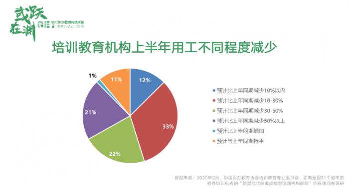 根据中国民办教育协会培训教育专业委员会疫情期间的调研,在访问的1500余家企业中,98%的企业上半年收入是下降的,只有2%的企业的收入能够与去年持平或与去年相比收入有所增加。