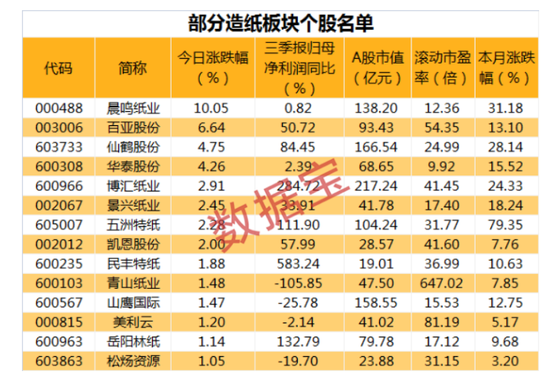 今日多只造纸概念股不同程度上涨,晨鸣纸业A股收盘涨停,H股收盘报涨14.05%,百亚股份、仙鹤股份、华泰股份涨幅均超过4%。