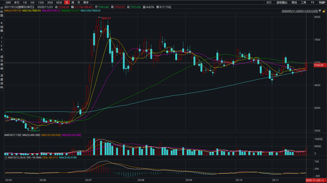 市场似乎在接续上周“醉酒行情”和“银行保险双轮驱动行情”,本周一(11月23日),白酒、银行和保险继续有所表现,同时券商股也参与到行情中来。