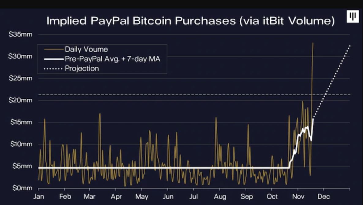 上面的图表显示了一条白色的虚线,代表了新开采的比特币的总供应量和最初的itBit数量。报告称,如果贝宝的增长持续下去,它购买的货币数量将超过最近发行的新货币供应量。