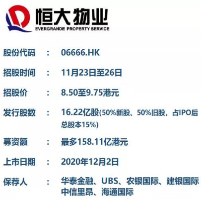 本周一,恒大物业发布公告,将于11月23-26日招股,公司拟发行16.22亿股股份,其中公开发售约1.62亿股,国际发售约14.59亿股,每股发行价8.50-9.75港元,市值介于约918.92亿-1054.05亿港元之间,募资额在137.83亿-158.1亿港元之间。每手500股,入场费为4924港元,预期将于12月2日上市。