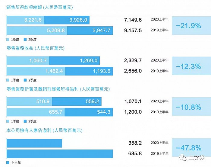 每间零售店年化收益由2019上半年的630万元减少到2020上半年的500万;