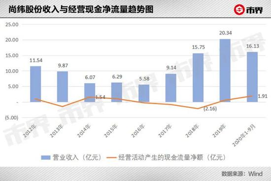 但从现金流的角度来看,尚纬股份却一直是一家不怎么赚钱的公司,直到2019年,其经营活动现金净流入一直维持在5400万元以下。2020年前三季度数据达到1.91亿元,但相关数据还未经审计。