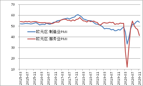 海外方面,欧洲各国PMI初值特别是服务业PMI明显低于预期,制造业PMI也较前值回落,导致欧洲股市表现较差;美国PMI好于预期,同时耶伦可能出任美国财政部长的消息也推升了美国股市。由于欧洲疫情二次爆发更早,所以对欧洲的经济的负面影响体现的更快一些。