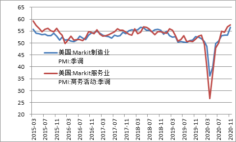 相比之下,由于美国疫情二次爆发的晚于欧洲,并且美国管控一直不够严格,所以美国的11月份制造业和服务业PMI均处于高位置。但是如果按照目前的美国疫情的发展趋势,未来不排除拜登上台后,加强管控措施,并最终影响经济复苏的可能性。