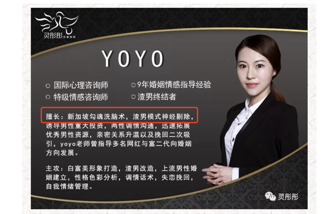 在简介中,授课导师的名号多为国家二级心理咨询师、特级情感咨询师、国际心理咨询师等,更有导师宣称擅长新加坡勾魂洗脑术,操控人性、渣男模式神经剔除,诱导男性重大投资,两性调情沟通等策略。