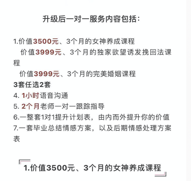 从课程推广来看,该机构已拥有一套完整的培训体系,授课内容包括“女神课程、轻松挽回、婚姻守护、情感私教”等,价格分别为3500元到8888元不等。课程中对方宣称10年间执导过10000+的案例实操,50位导师可供选择,在线一对一指导教学。
