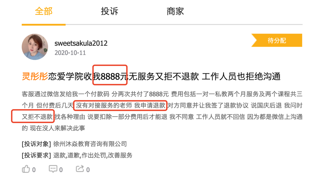 此外记者了解到,该公司还存在“无服务、不退款”等情况。有学员举报表示,灵彤彤恋爱学院收费8888元无服务又拒不退款,工作人员也拒绝沟通。