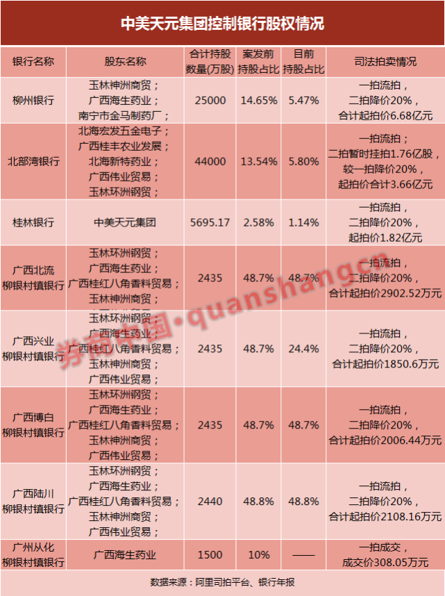 以首次拍卖时的挂牌股权综合计算,截至案发前,中美天元集团通过3家关联公司至少控制柳州银行14.65%股权,通过5家关联公司控制北部湾银行13.54%股权;直接持有桂林银行约5700万股股份,在彼时该行总股本中占比约2.58%。