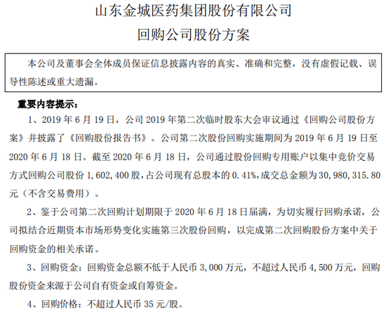 此外,值得注意的是,就在上述股价翻倍、同期高管“精准”减持期间,金城医药还推出了第三次回购方案。6月19日,金城医药公告称,公司拟以集中竞价交易的方式,采用自有资金或自筹资金3000万元~4500万元,自公司股东大会审议通过回购股份方案之日起6个月内,以不超过人民币35元/股回购公司股份。